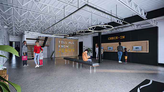 Exterior and Interior Renderings, floor plans and elevation details help shape the vision for this future church upfit in Fayetteville, NC. 3DS Max 2025, Lumion 24-25, Photoshop 26.